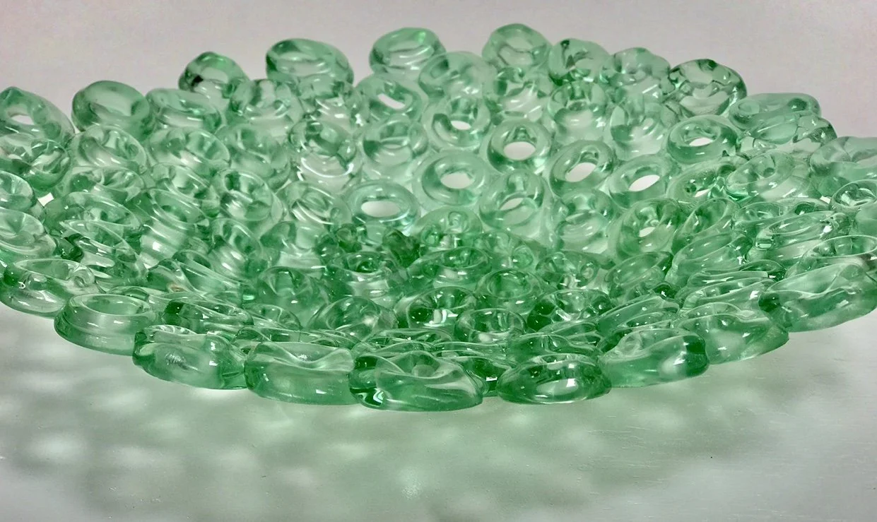 Stacy creates her exclusive Bottle Bowls by cutting many many bottles and designing and kilnforming those pieces to create the bowls. The bowls are fired at 1450 degrees, then slumped into a custom made bowl mold at a separate firing. These one of a kind bowls are filled with light, spirit, and wonderful energy. One aspect of this series is its feeling of emergence, of new beginnings. Bowls are made from the tops of Topo Chico bottles, as well as the bottoms. Each signature bottle bowl is completely unique in shape, size, and exclusive to her studio.